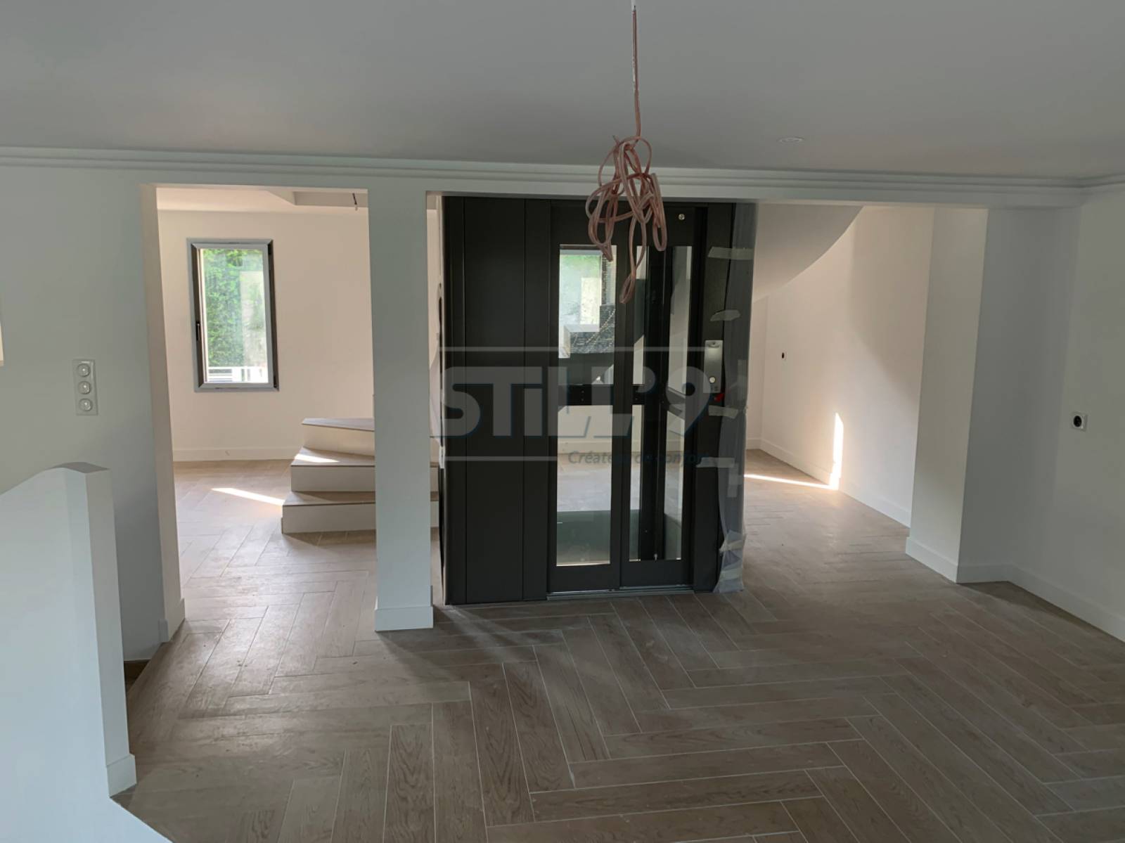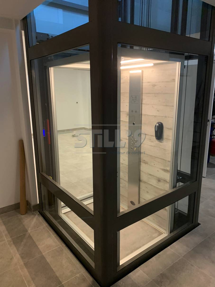 Notre client a opté pour un modèle en structure autoportantes placé au centre de l'habitation. Celui-ci dessert les différents niveaux du logement facilitant ainsi le déplacement de tous les usagers. L'escalier est bien toujours disponible.