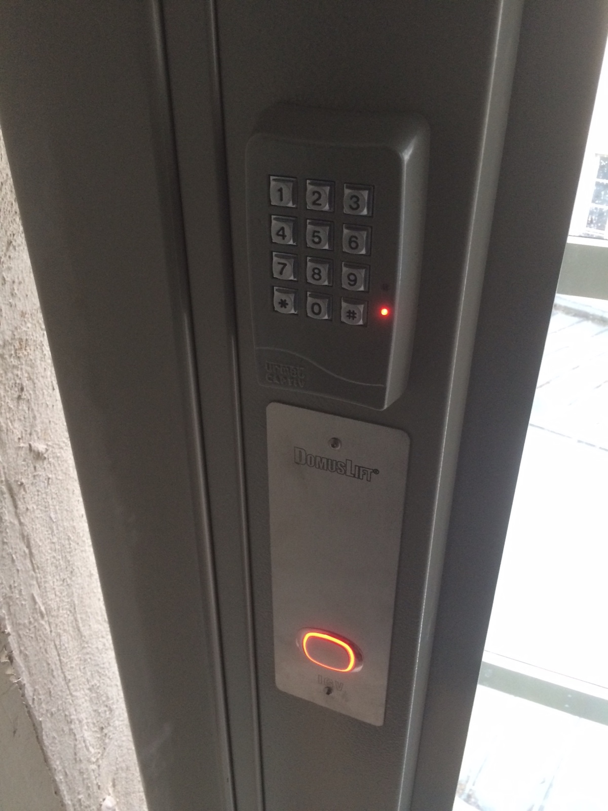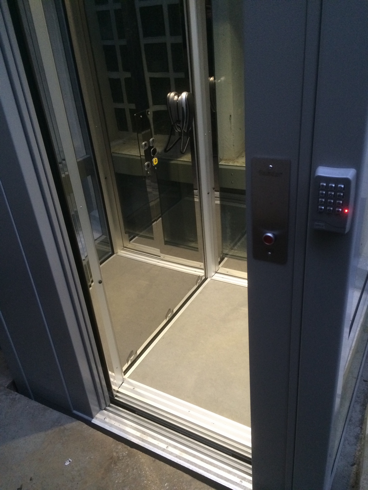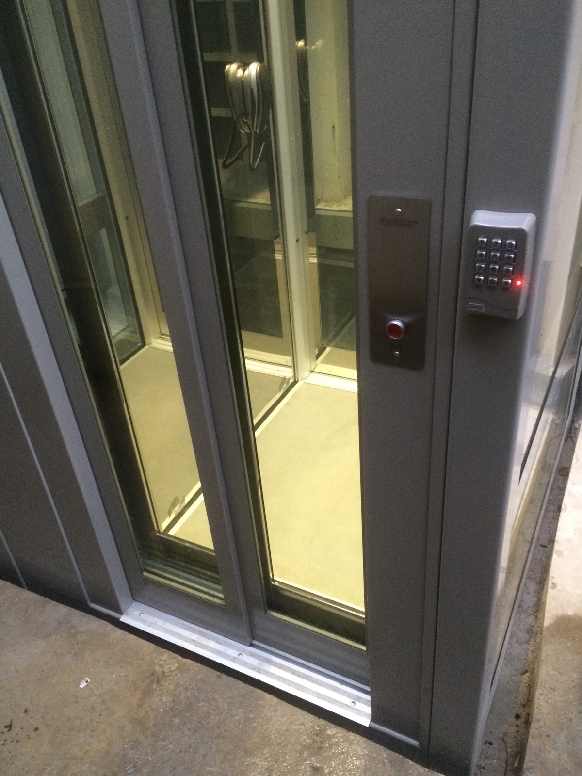 Au niveau 0 le châssis de la porte palière est recouvert d'une peinture RAL spéciale (gaufré) Ral 7030 et d'un verre transparent. Le volet lui est en verre transparent et acier inox brillant 128. La configuration est la même au niveau 1.