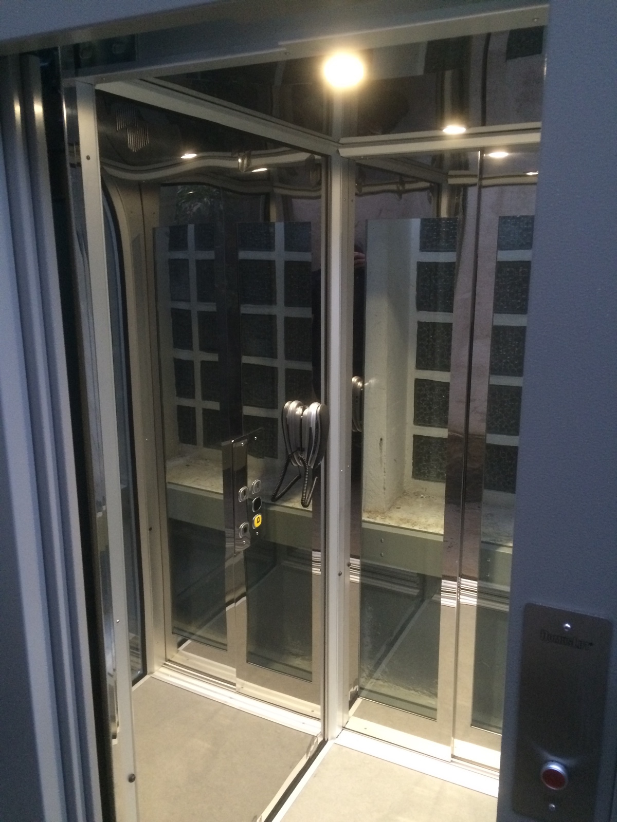 Les dimensions intérieures de cabine de cet ascenseur pour appartement sont de 800 x 1000 (larg x prof). Elle est en aluminium anodisé naturel. A l'intérieur de la cabine, le plafond est en inox brillant avec sports à LED, le plancher est en marmoleum 3866 Eternity. Le panneau côté gauche est en acier inox brillant 128 et le panneau côté droit est en verre transparent 4+4. Les commandes de l'ascenseur sont encastrées sur le panneau étrier dans une petite boite plate en acier inox satiné 127 (std) étanche.