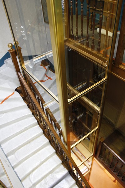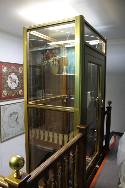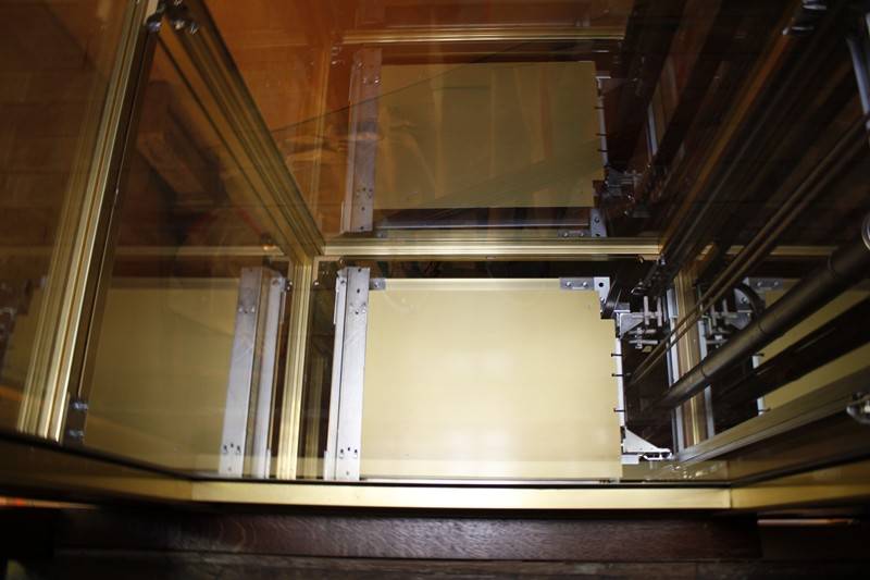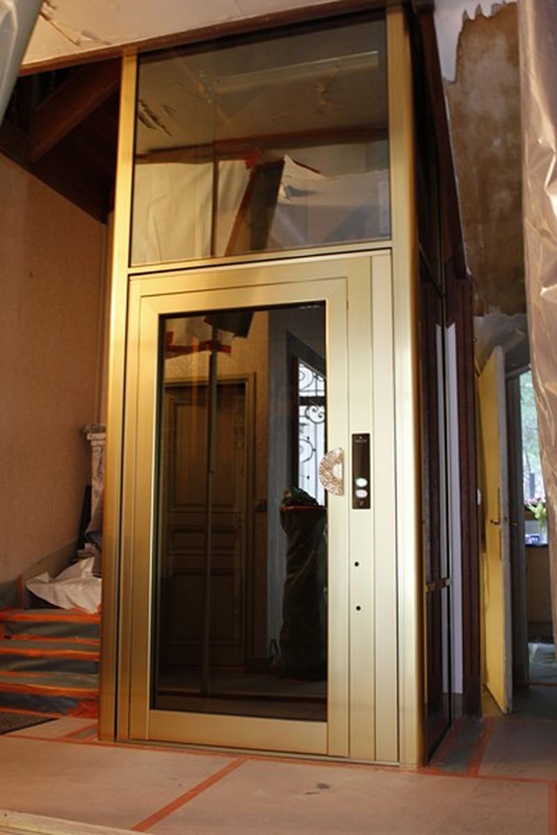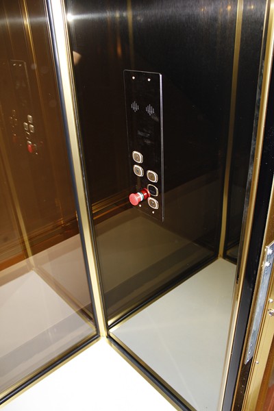 En cabine, notre cliente a choisi un intérieur tout en inox brillant couleur or. Le plafond est également en inox brillant avec éclairage à LED et le sol est un granit reconstitué de couleur blanc. Les dimensions intérieures de cabine sont de 1000 mm x 800 mm (larg x prof). Sur chaque porte palière, nous avons installé des poignées uniques choisies par notre cliente.