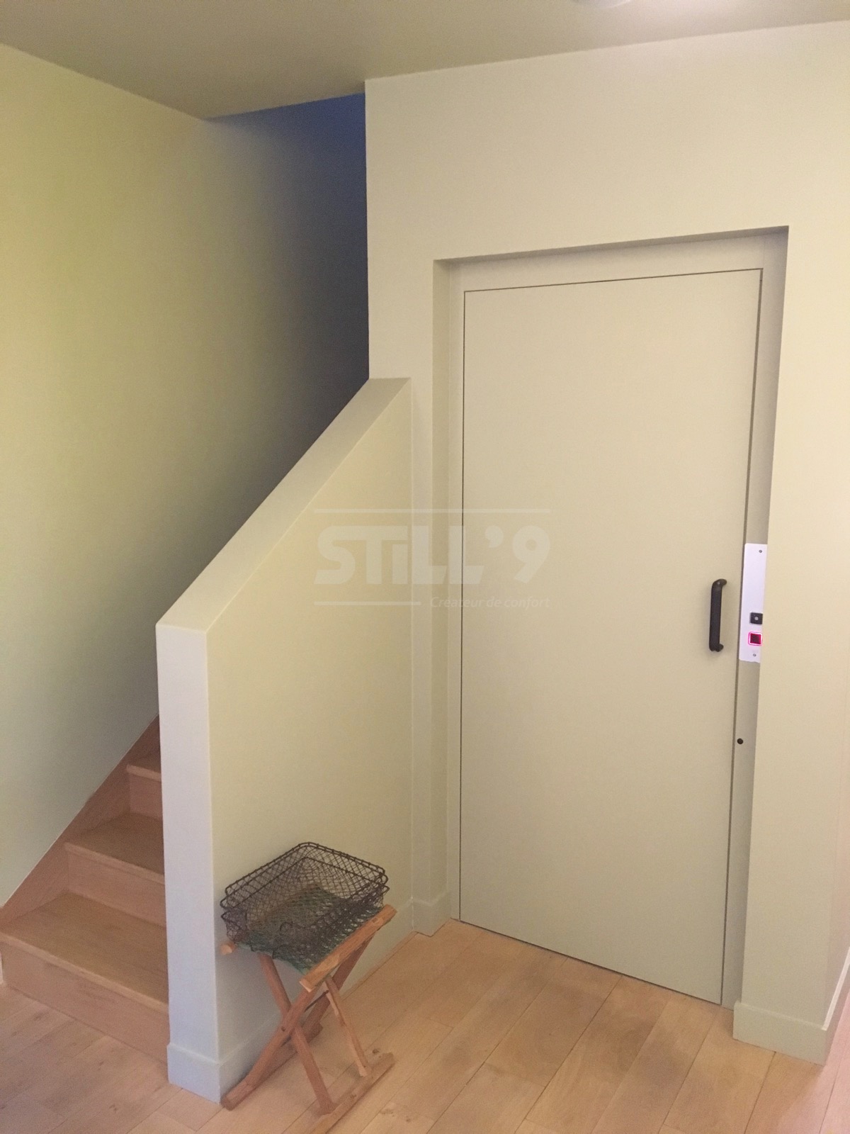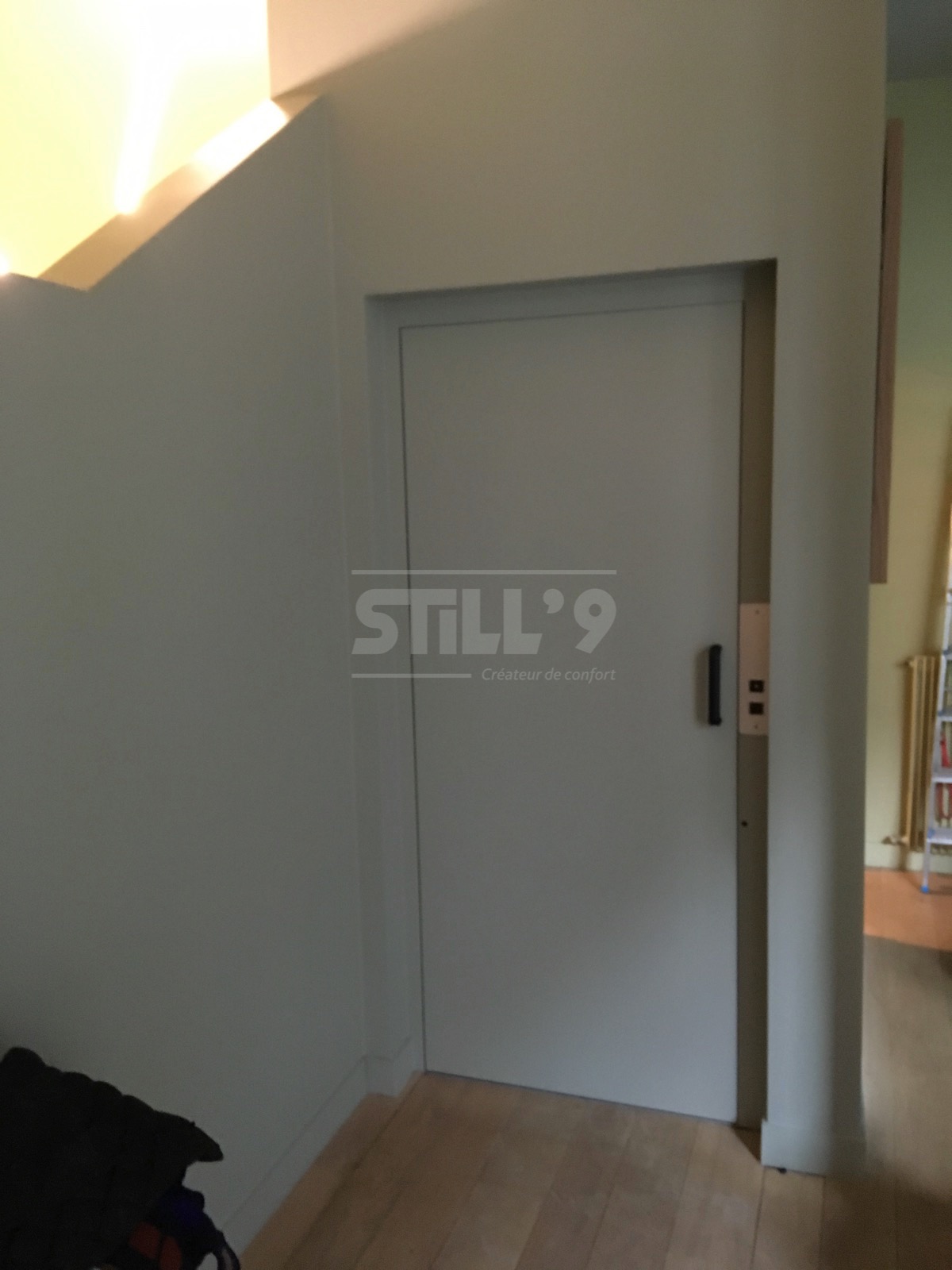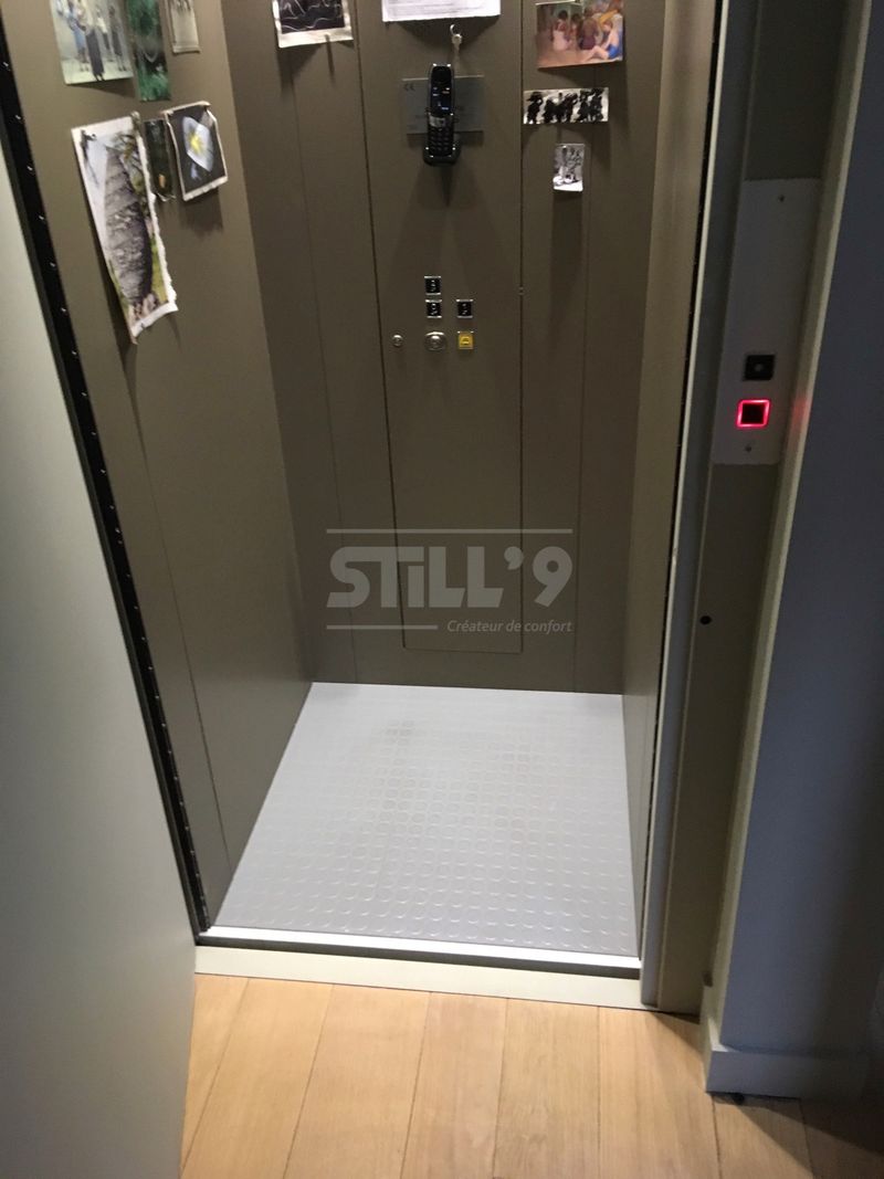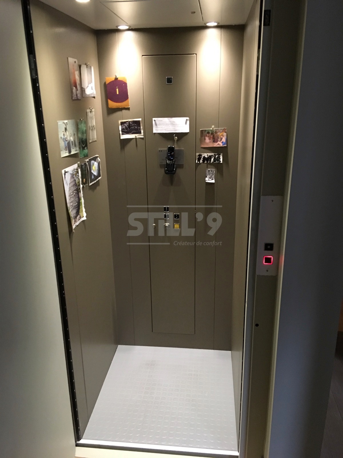 La société STILL'9 vient de créer un ascenseur privatif dans un appartement situé à Paris 75. Il s'agit d'un ascenseur privatif intérieur en gaine maçonnée. Cet élévateur dessert les trois niveaux de l'habitation. Sa charge maximale s'élève à 250 kg et sa vitesse est de 0,15 m/s (normes européennes).