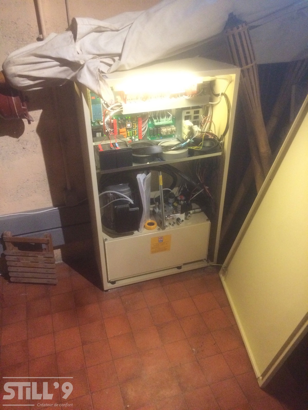 Cet appareil se déplace à l'intérieur d'une gaine maçonnée (gaine totalement fermée) en béton armé. Les dimensions de la gaine sont de 1000 x 1110 mm (larg x prof). Il dessert les 3 niveaux de l'habitation et possède une course d'élévation de plus de 5 mètres. La charge maximale reprèsente 250 kg.