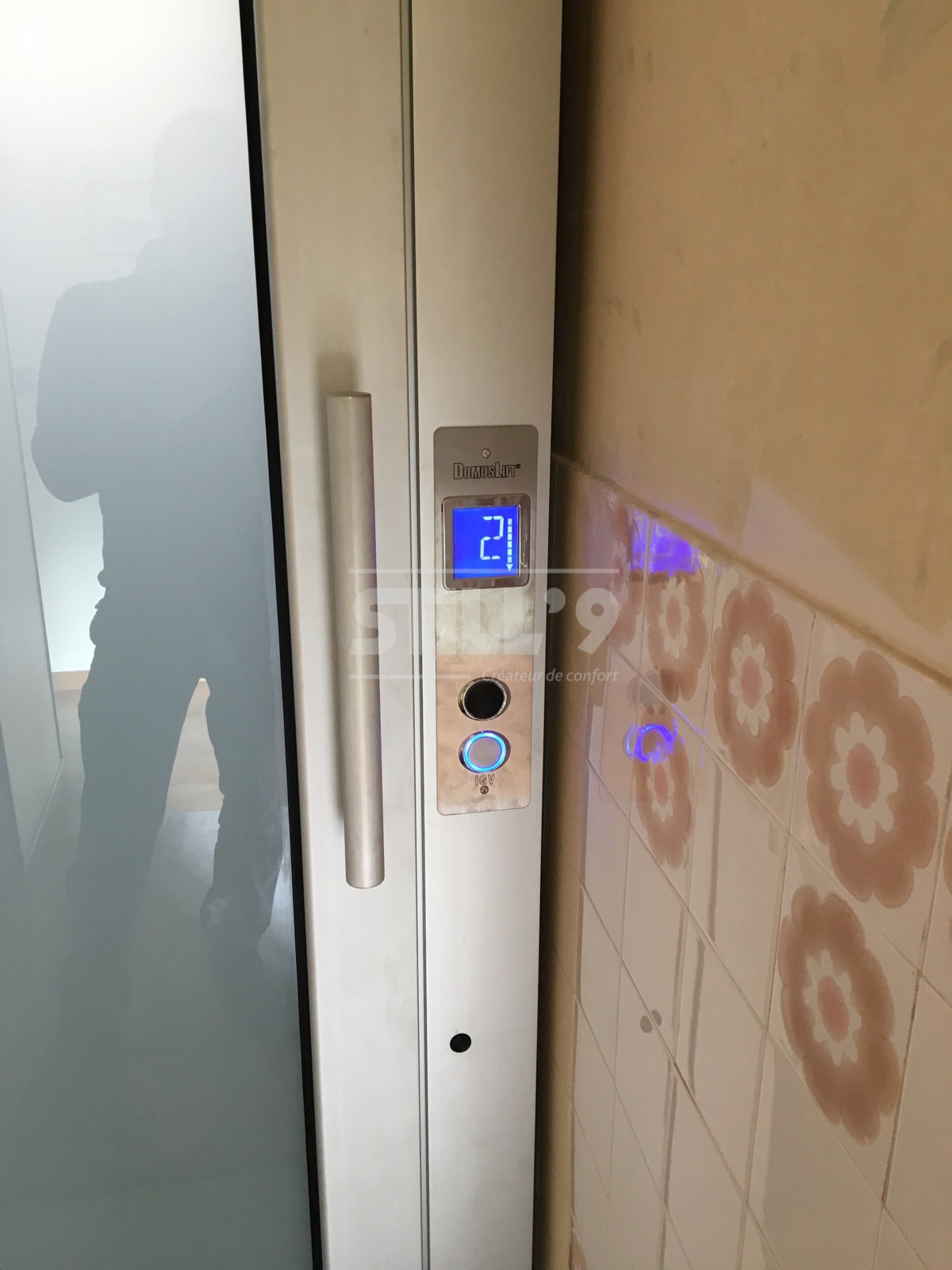 Cet ascenseur situé à Livry-Gargan est donc installé dans une gaine maçonnée en béton armé. La gaine fait 860 mm x 1276 mm (larg x prof). La charge de cet élévateur est de 250 kg. La course s'élève à 5615 mm. Cet ascenseur privatif est équipé de portes battantes.