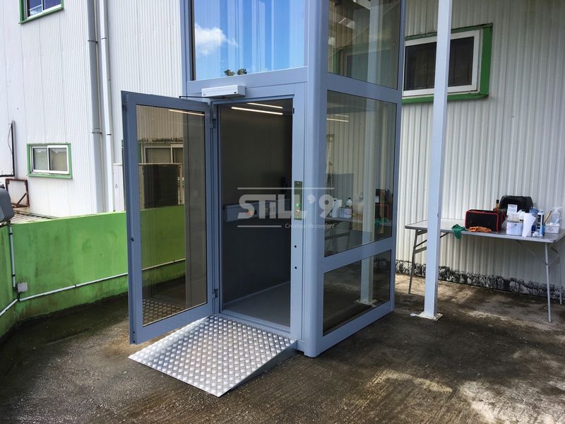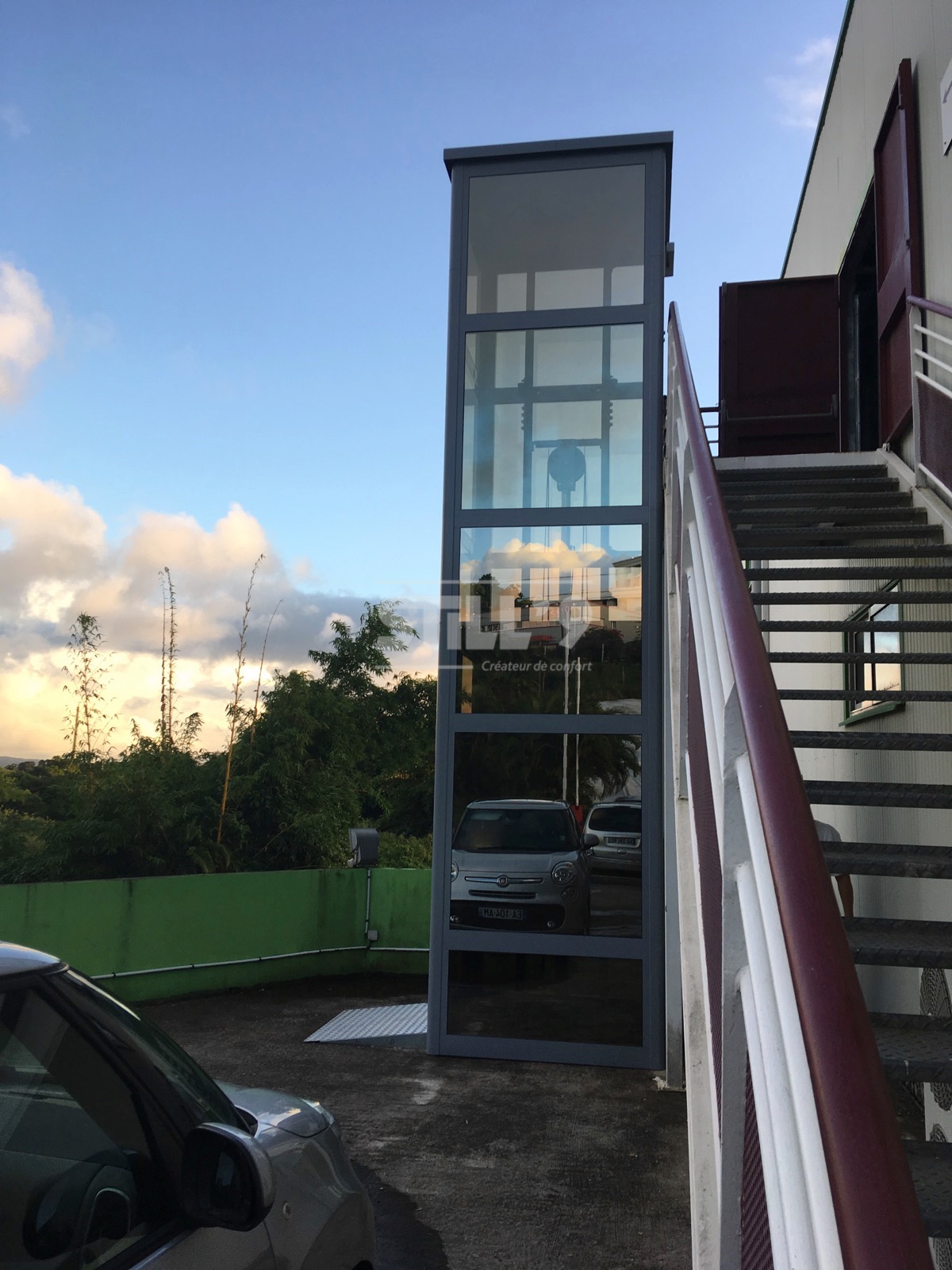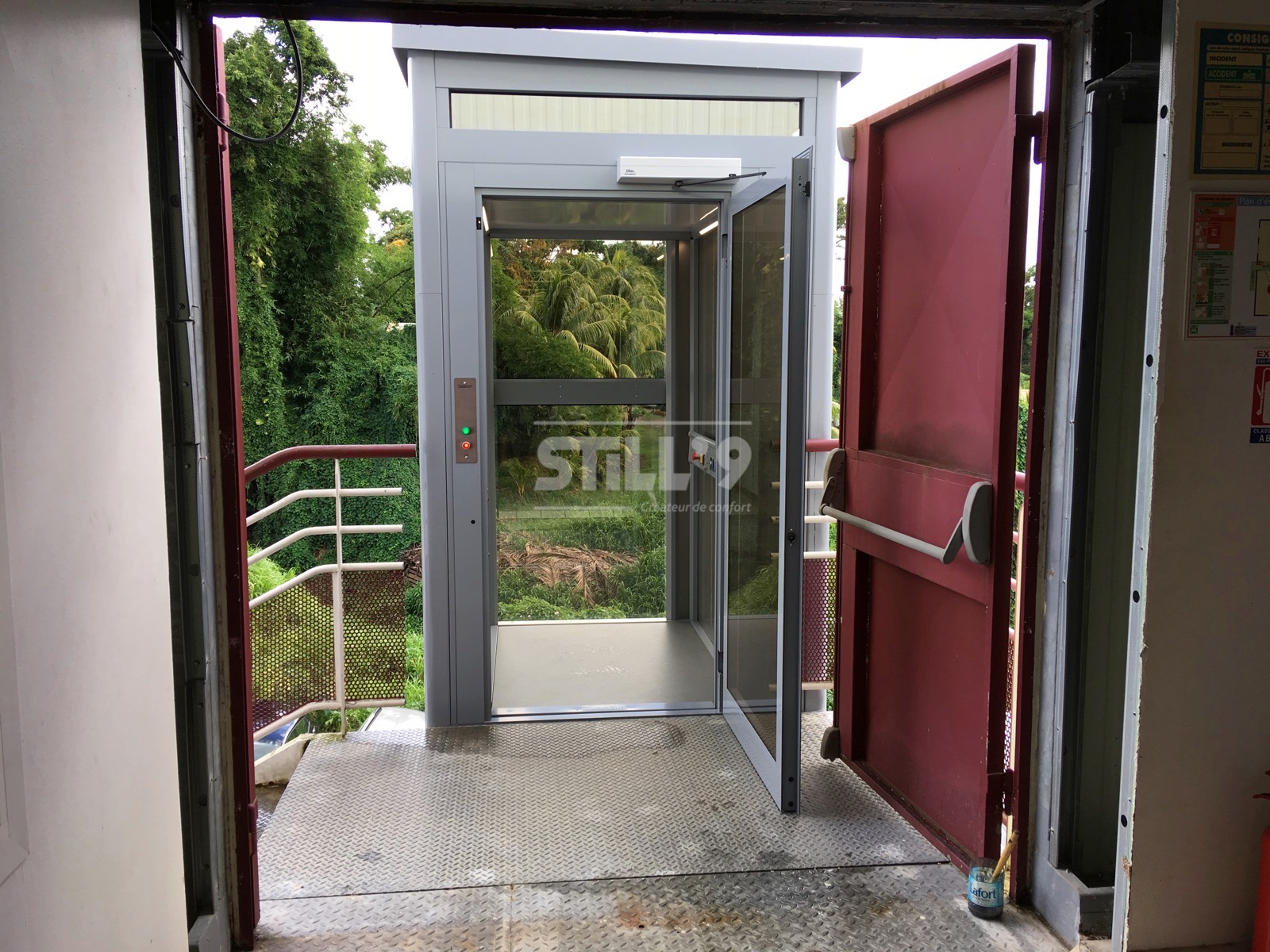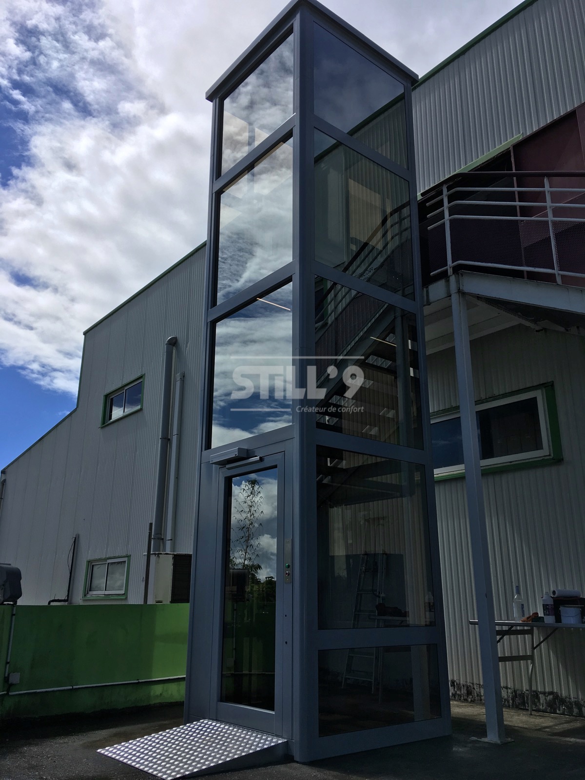 La société STILL'9 vient d'implanter un élévateur extérieur dans un batiment public en Martinique. Cet ERP (Elévateur Recevant du Public) comprend un étage. A l'intérieur du bâtiment l'installation d'un élévateur n'étant pas envisageable, nous avons procédé à une installation extérieure.