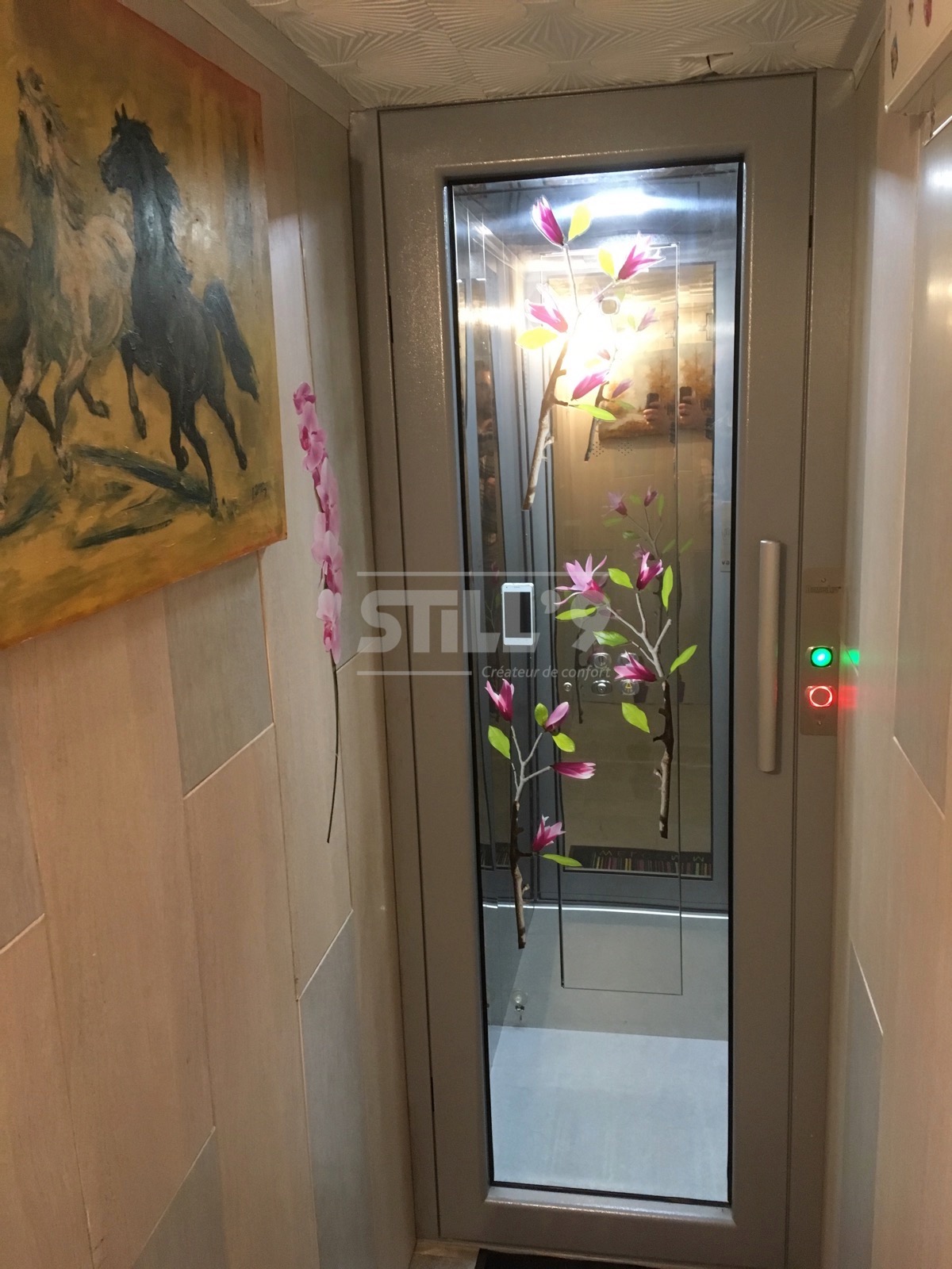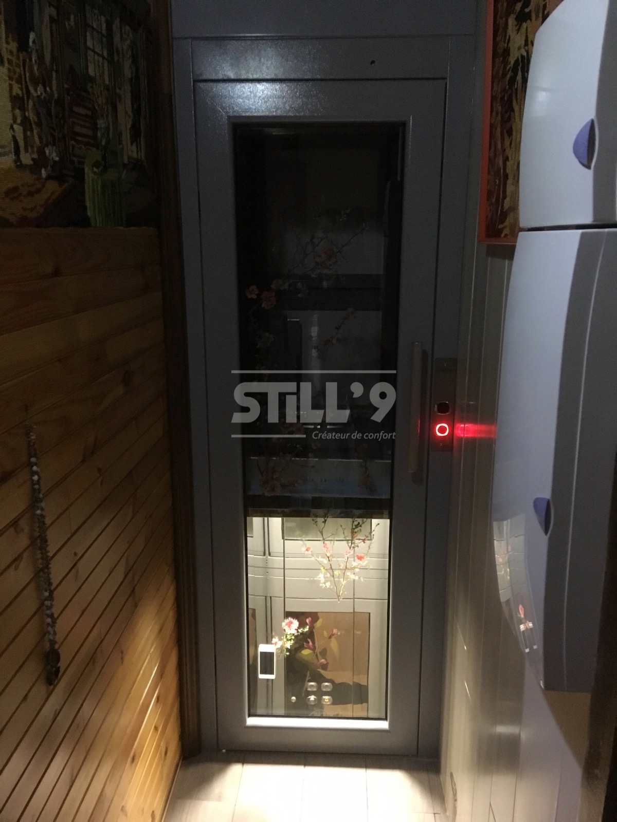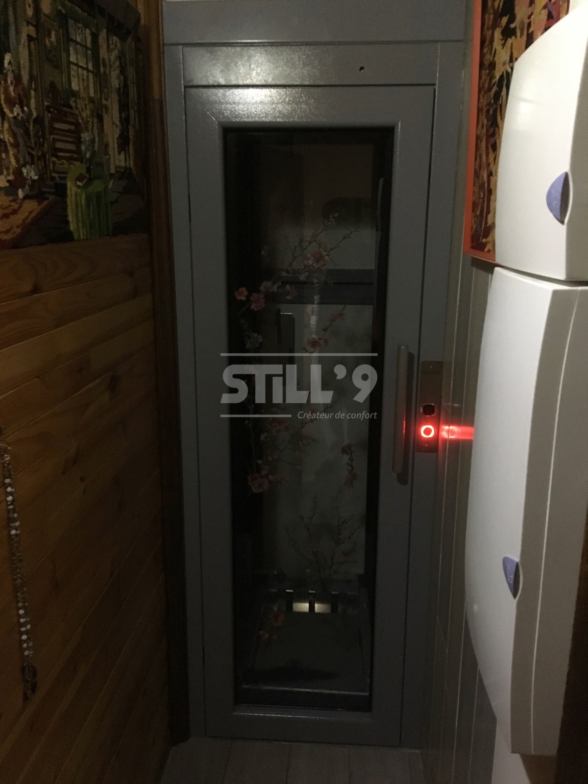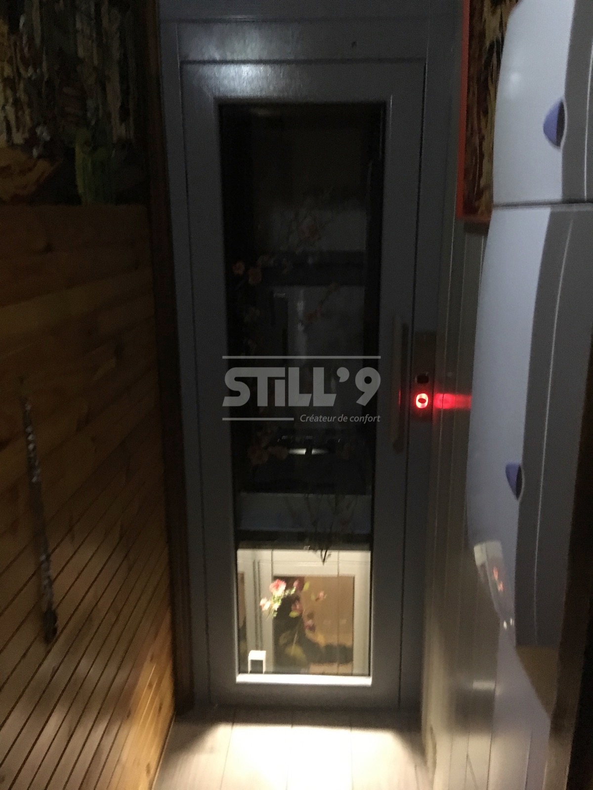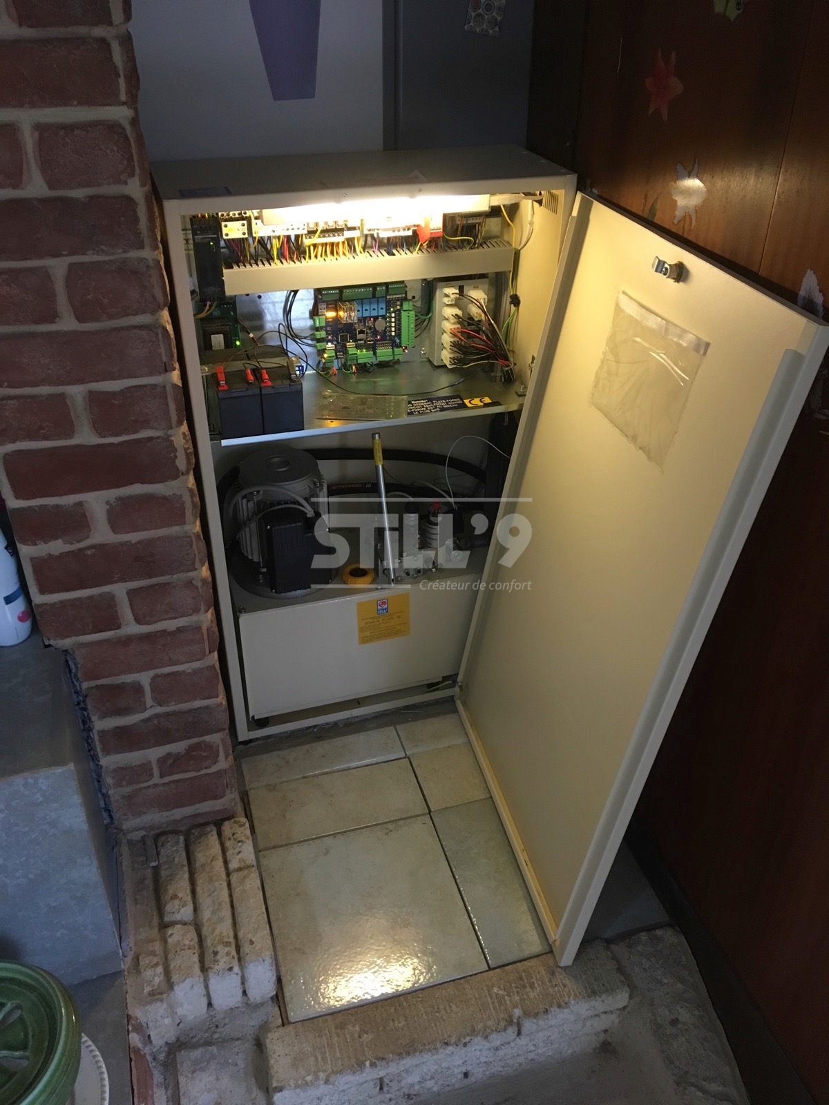 Notre client ayant des difficultés à se déplacer, l'implantation d'un ascenseur aux dimensions réduites devenait une priorité. L'ascenseur en gaine maçonnée installé près de Villiers-Saint-Frédéric, dessert les deux niveaux de l'habitation. La course s'élève à 2340 mm. La cabine est habillée d'un sol en marmoleum et l'éclairage s'effectue à l'aide d'un plafonnier à LED.