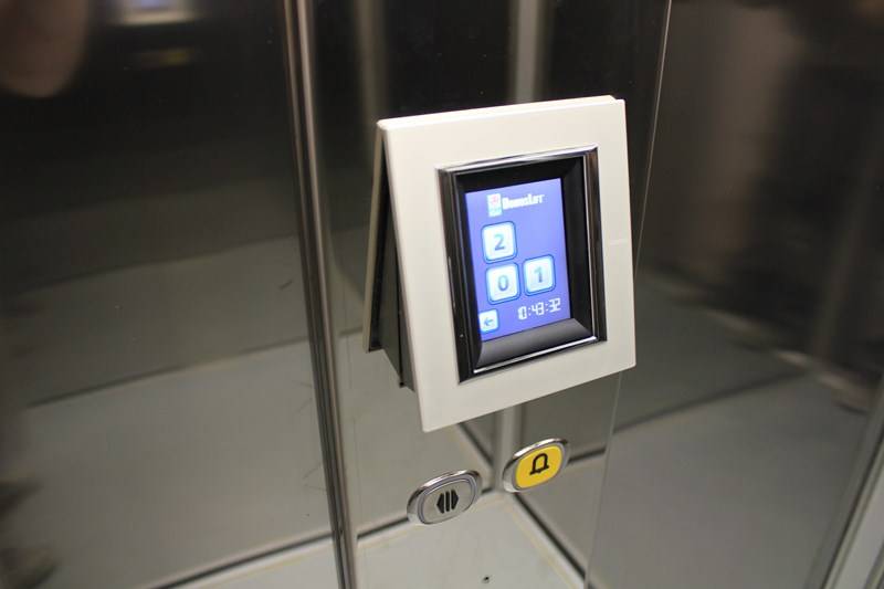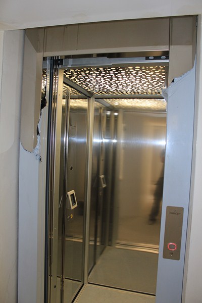 Les dimensions intérieures de cabine sont de 800 x 1000 mm avec des ouvertures de portes à deux vantaux automatiques coulissants pour un passage de portes de 650 mm. Notre client a privilégié le design avec un intérieur cabine en acier inox brillant ainsi qu'un tableau à commandes digitales.