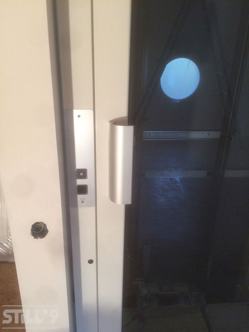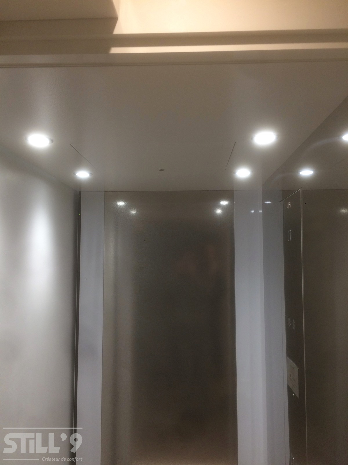 Les dimensions intérieures de cabine sont de 900 x 1300 mm (larg x prof). Le plafond de la cabine est en tôle peinte en blanc Ral 9010 avec des spots à Led et anneaux en inox. Le plancher lui est en marmoléum STD. Les autres panneaux sont en acier inox brillant 128. Les portes sont manuelles et panoramiques en aluminium et vitre transparent. Pour finition nous avons une peinture RAL 9010, les poignées sont en aluminium anodisé naturel et la boite à boutons est plate en aluminium également.