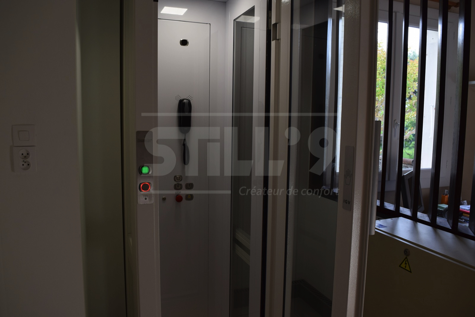 Cet ascenseur privé dont la structure est entièrement en acier, dessert les deux niveaux de l'habitation et sa charge est de 250 kg. Il est composé de portes battantes laquées Ral 9010 blanc pur (gaufré). Les dimensions intérieures de cabine sont de 480 x 550 x 2000 mm (larg x prof x H). Ce petit ascenseur est équipé d'une boite à boutons plate en inox satiné, d'un téléphone et d'un avertissement de surcharge. Il dispose également de barrières électroniques.