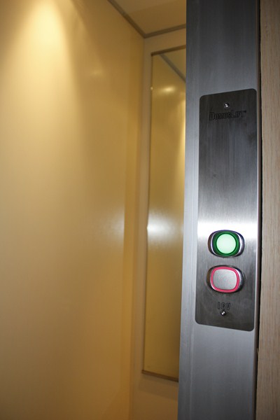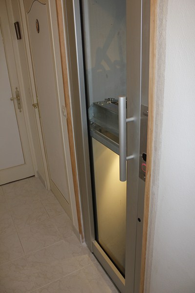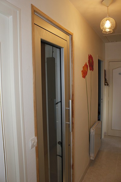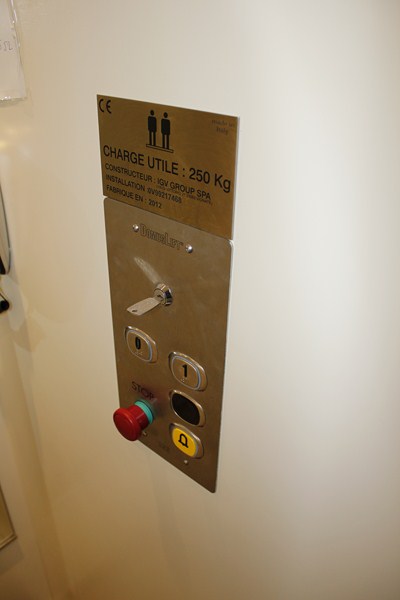 L'ascenseur de très petites dimensions dessert les deux niveaux de la maison sur une hauteur de course de plus de 3 mètres. Les dimensions intérieures de cabine sont de 600 x 900 mm (larg x prof) avec des ouvertures de portes de 600 mm.