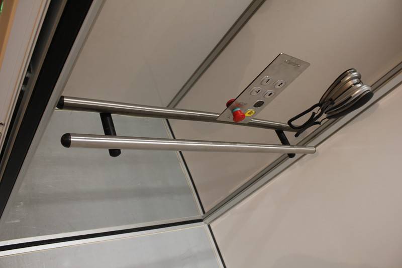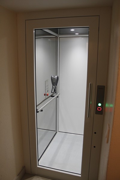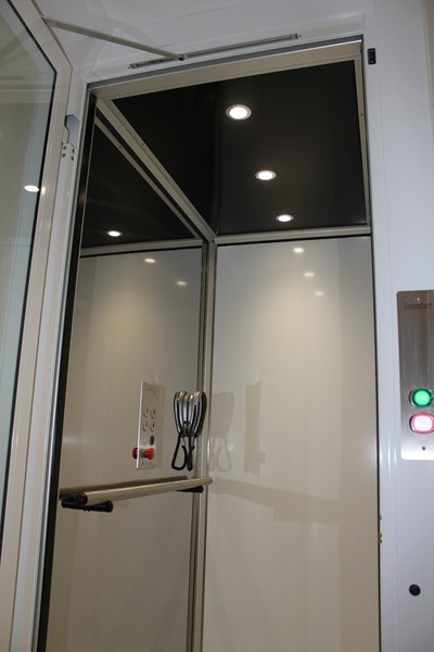 Le plafond est en aluminium noir brillant avec éclairage spots à LED. Le sol est une planche de CP pour pouvoir coller un carrelage personnalisé. Les dimensions intérieures de cabine sont de 800 x 1200 mm. Les portes palières sont vitrées transparentes avec ossature en aluminium et groom de portes encastrés dans le châssis, le tout laqué RAL 9010.