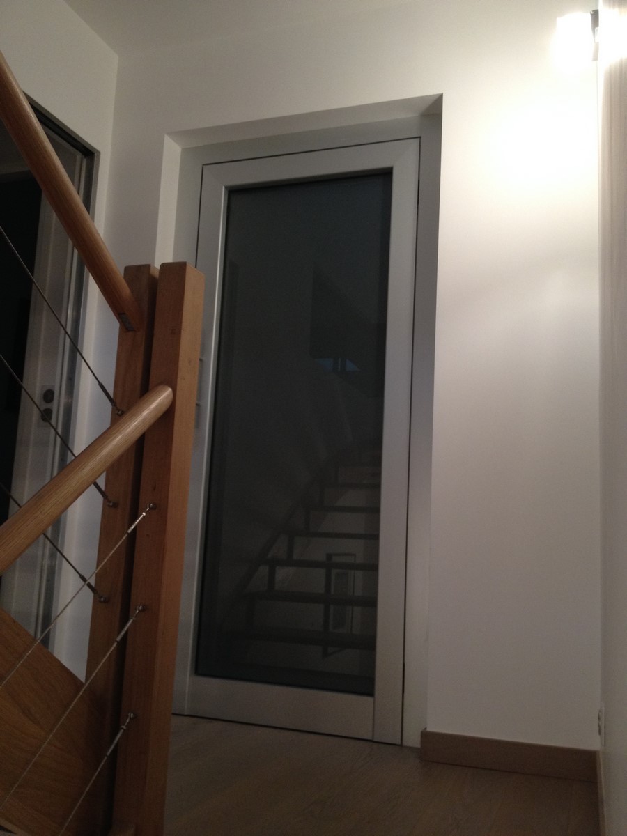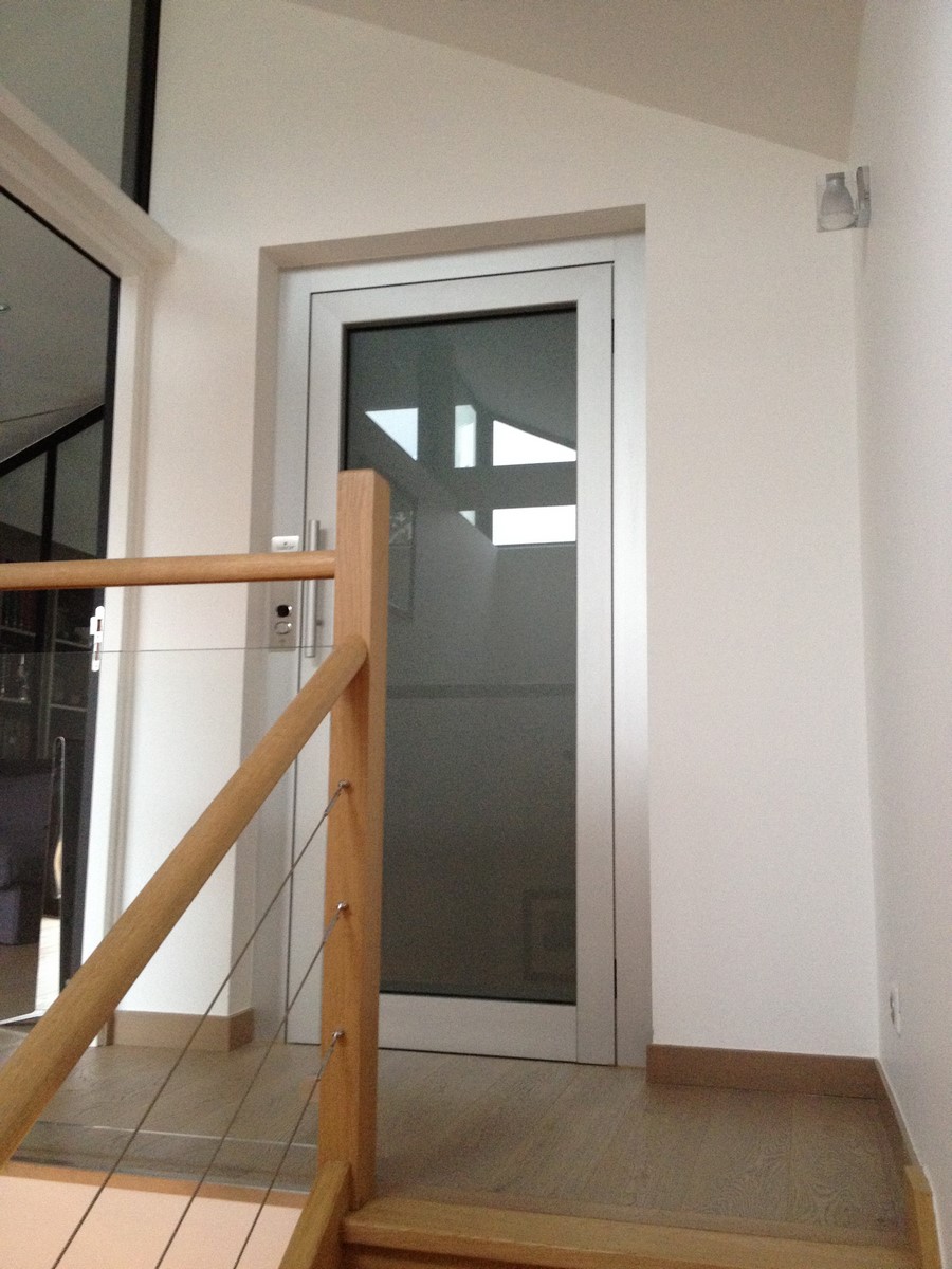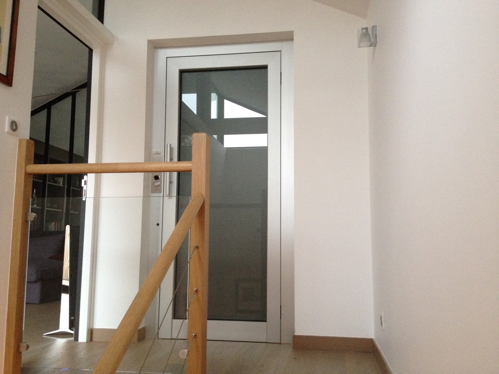 La cabine de l'ascenseur sur mesure est en aluminium anodisé équipée de portes battantes panoramiques en aluminium et d'un vitrage blanc lait. L'ouverture de ses portes est de 950 mm. Les poignées sont en aluminium anodisé naturel et les commandes sont disposées dans une boîte plate en acier inox satiné.