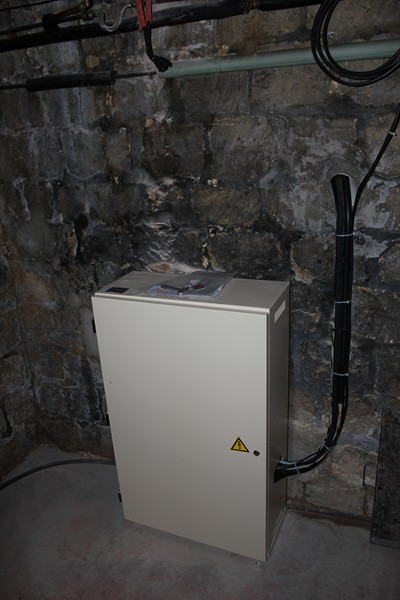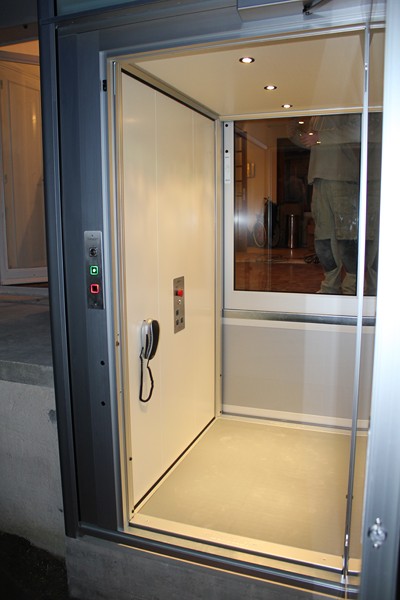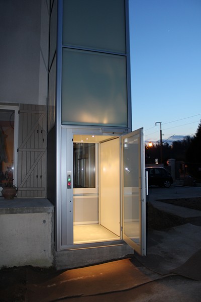 L'ascenseur en pylônes auto-portants dessert les trois niveaux de la maison, sur une hauteur de course de plus de 5 mètres. Cette cabine dispose d'un service traversant et ses dimensions intérieures sont de 1000 x 1300 mm avec un passage de portes de 950 mm, ce qui permet d'accueillir une personne en fauteuil roulant avec un accompagnateur.