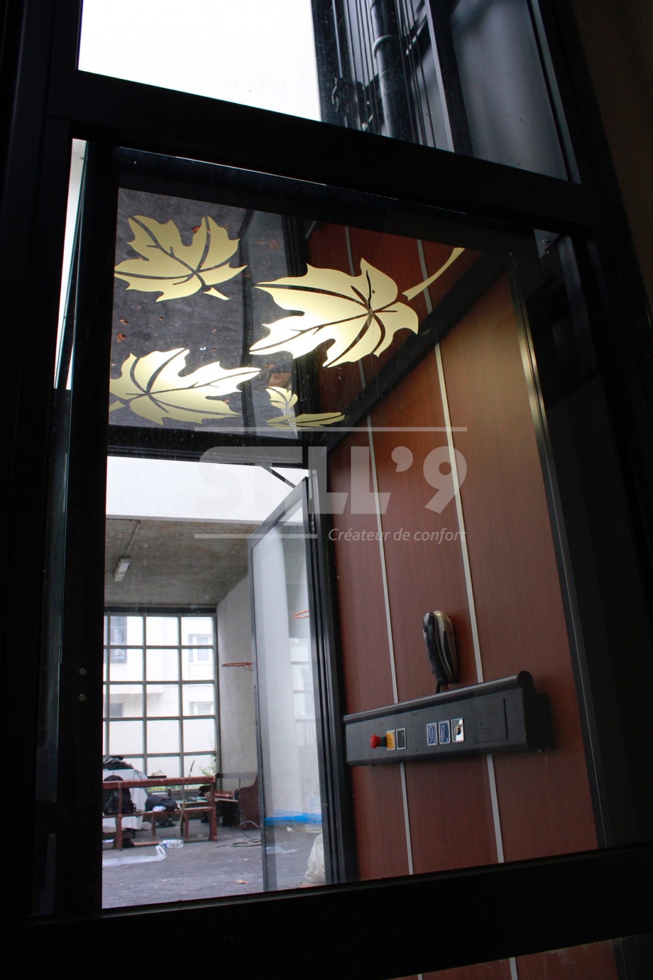 Les dimensions intérieures de la cabine sont de 1000 x 1400 mm. Les portes qui composent cet élévateur placé à Paris dans une école sont battantes avec ouverture automatique. Le service des portes est traversant, c'est à dire en vis-à-vis. Notre client a choisi un plafond en inox brillant avec motifs floral. Le plancher quant à lui est brut, notre client souhaitant son propre revêtement.