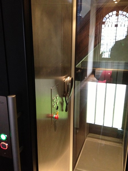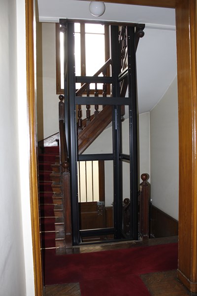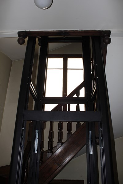 L'ascenseur de cage d'escalier est habillé d'un pylône auto-portant laqué RAL Noir et il est entièrement équipé d'un verre transparent 4.4.2 mm. Cette cage d'escalier dessert les quatre étages et a des dimensions de 1077 mm x 1072 mm (larg x prof), ce qui permet de recevoir notre ascenseur fabriqué intégralement sur mesure, le tout sur une hauteur de course de plus de 11 mètres.