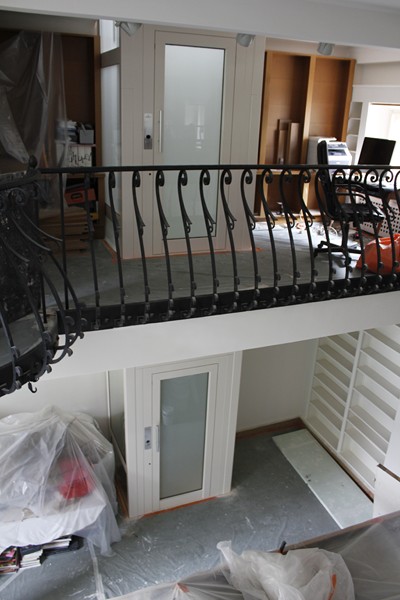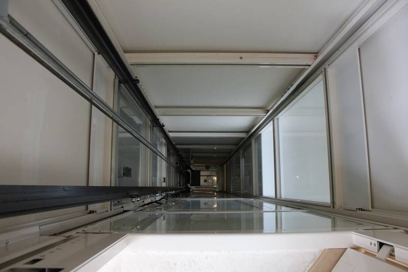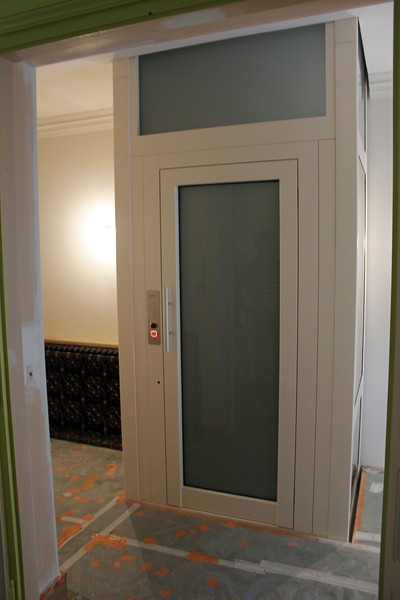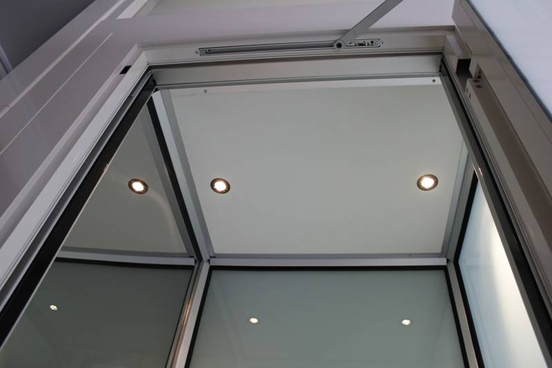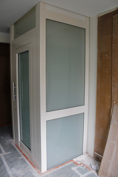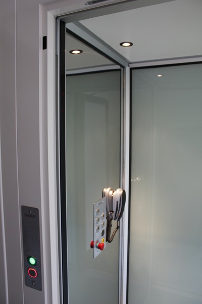 En cabine, notre cliente a choisi un intérieur tout vitré opale. Le plafond est en aluminium blanc avec éclairage à LED et le sol est un granit reconstitué de couleur blanche. La cabine à des dimensions intérieures de 900 x 750 mm (larg x prof). Chaque porte palière est équipée d'un verre opale 44.2, d'un groom de porte encastré donc non visible et d'une poignée en aluminium laqué Ral 9010.