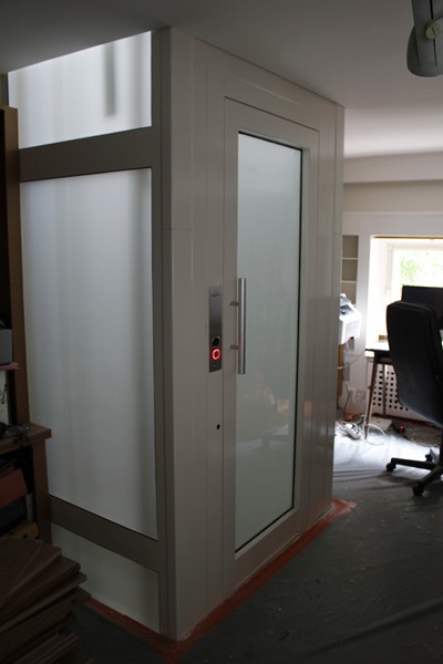 Sur ce projet, nous avons pu installer notre ascenseur particulier autoportant contre un mur porteur. Au niveau zéro le pylône auto-portant à des dimensions extérieures de 1387 mm x 1002 mm. La structure est équipée de verres opales 44.2 sur toute la hauteur, les portes palières et la cabine sont en aluminium laqué Ral 9010. L'élévateur domestique se déplace sur une course d'élévation de 12 mètres.
