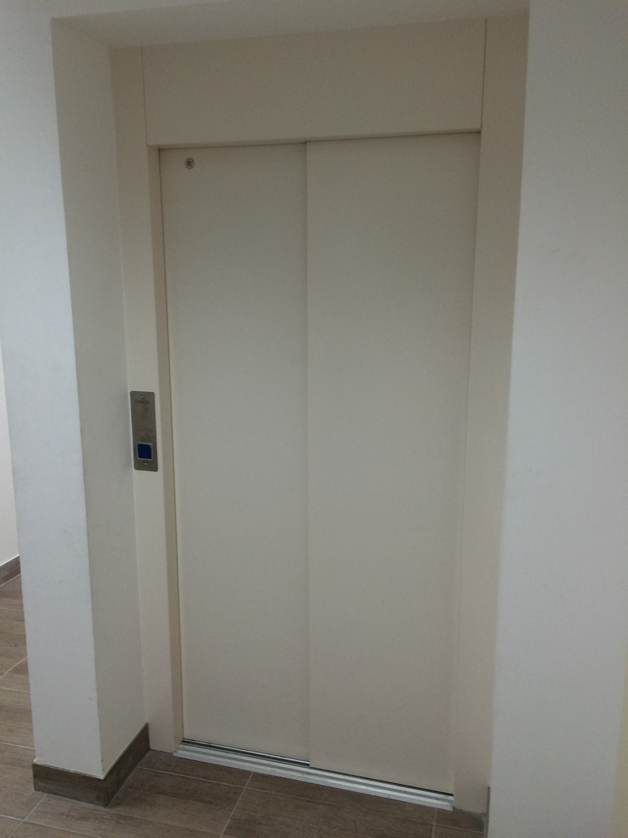 L'élévateur pmr pour erp dispose d'une cabine aux dimensions intérieures de 1000 x 1300 mm (lag x prof) avec des portes automatiques coulissantes pleines laqué Ral 9010, pour un passage de portes de 950 mm.