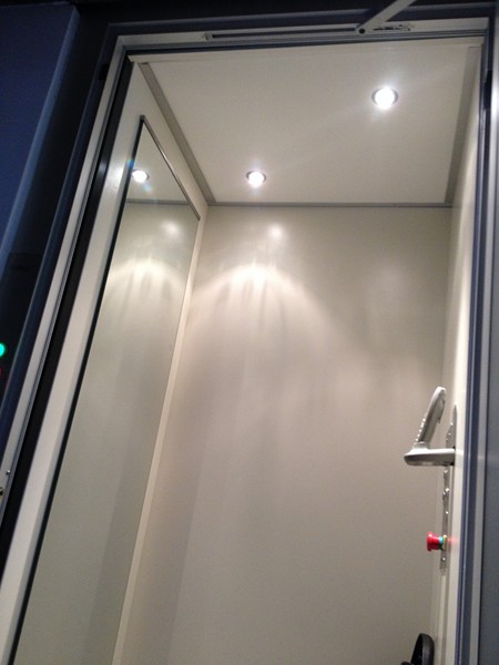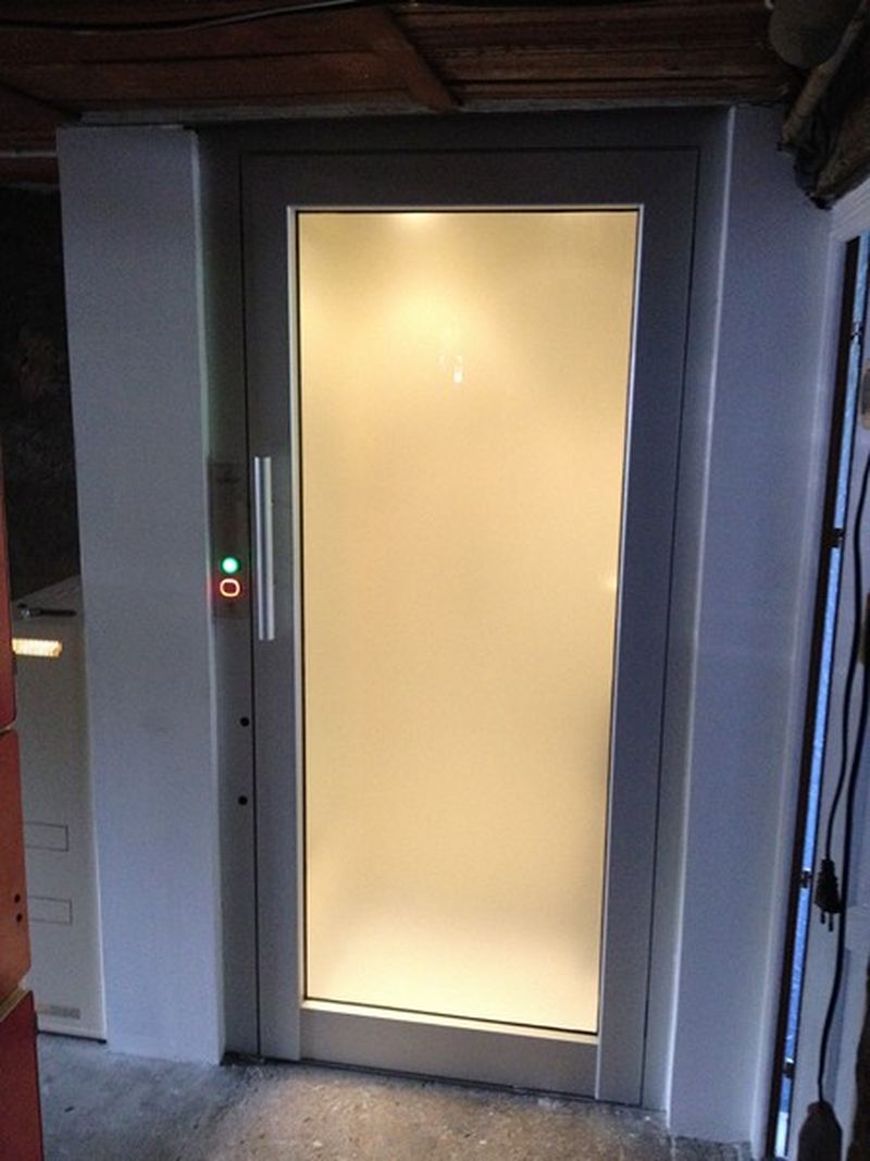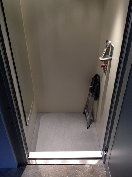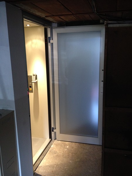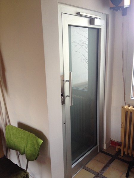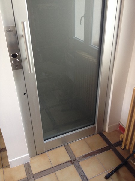 Les dimensions intérieures de cabine sont de 850 x 690 mm (larg x prof). Les trois panneaux (étrier, côté droit et arrière) sont en tôle plastifiée. Le plafond est blanc avec des spots et le plancher est en marmoleum STD (lino). Les portes palières battantes et panoramiques sont en aluminium et vitre transparente, les ouvertures sont de 850 x 2000 mm. Notre ascenseur pour espace réduit possède également un téléphone, des barrières électroniques et un avertissement de surcharge.