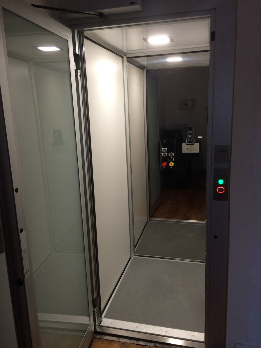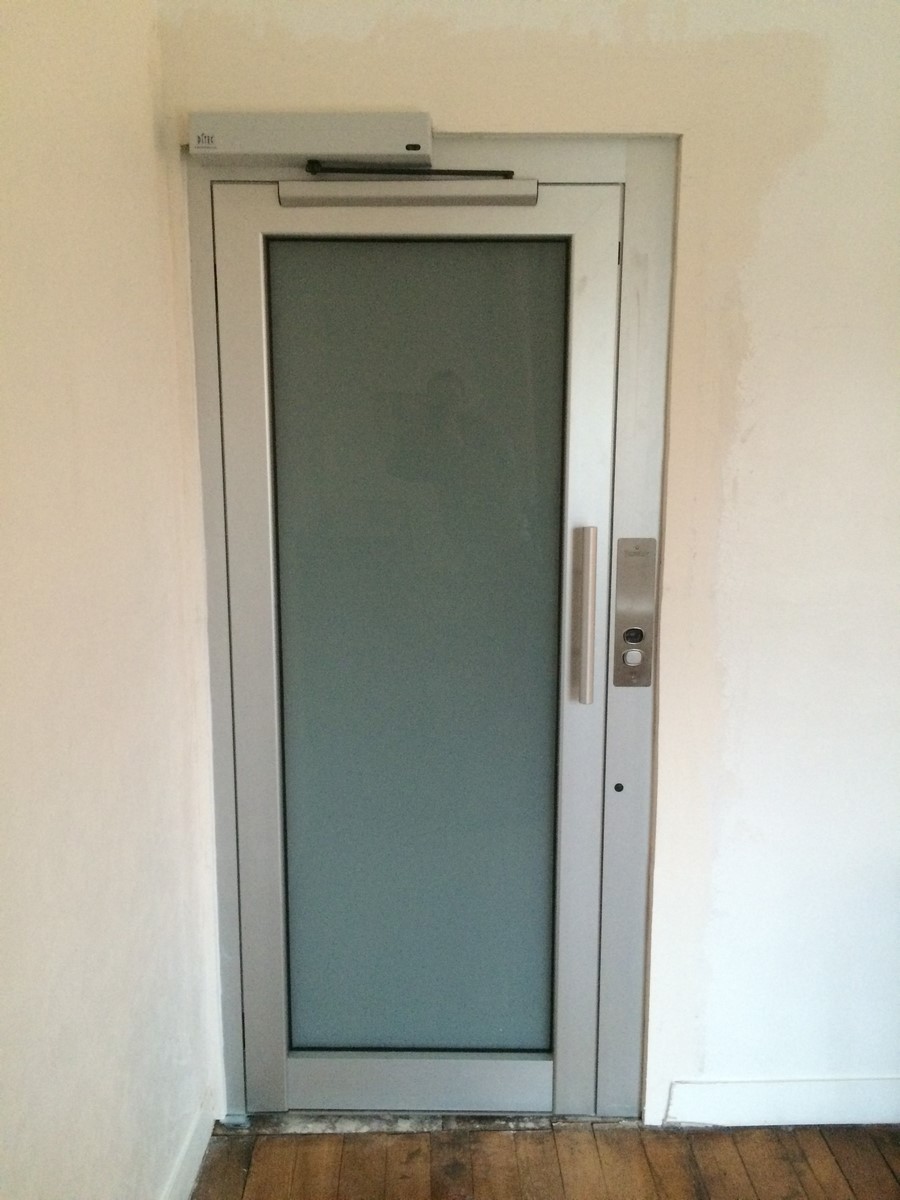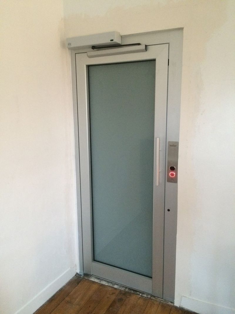 Les portes palières de ce petit ascenseur pour particulier sont battantes et panoramiques en aluminium anodisé naturel et vitre opaque (blanc lait). Elles sont identiques pour les trois nveaux. Les poignées sont également en aluminium anodisé naturel. Cet ascenseur privatif possède de nombreux accessoires. Un téléphone est placé à l'intérieur de la cabine, un avertissement de surcharge et des barrières électroniques (barrières infra-rouge à toute hauteur), et bien d'autres encore.
