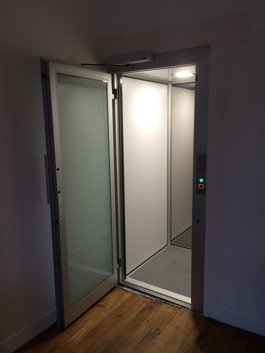 Ce petit ascenseur pour particulier dessert les trois niveaux de l'appartement. Il a été posé dans une gaine maçonnée en béton armé. La cabine est en aluminium anodisé naturel et les dimensions intérieures sont de 800 x 1000 mm (larg x prof).
